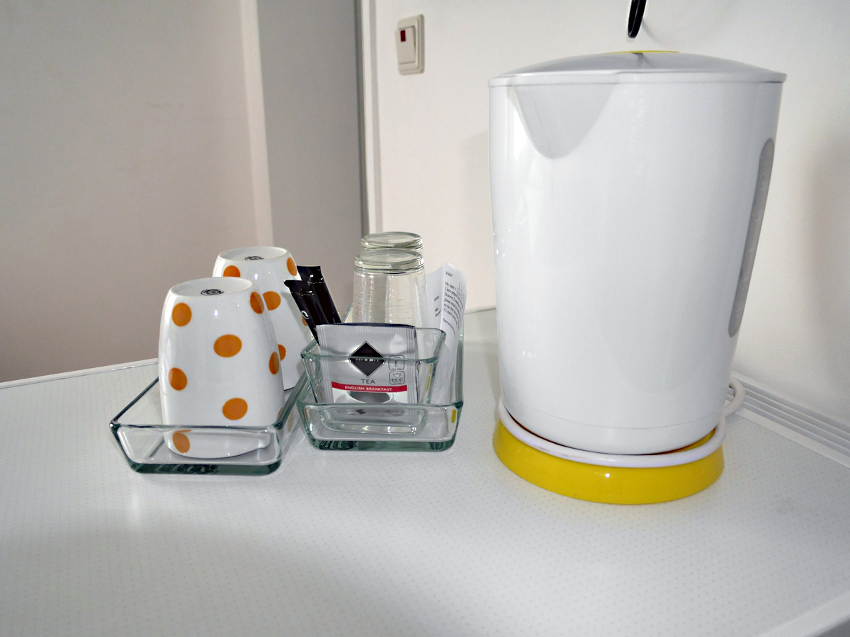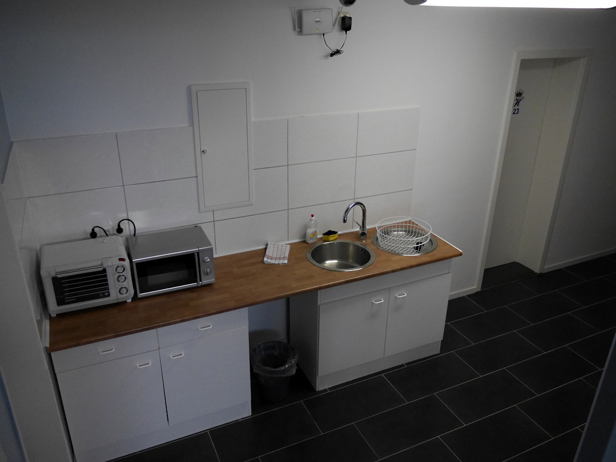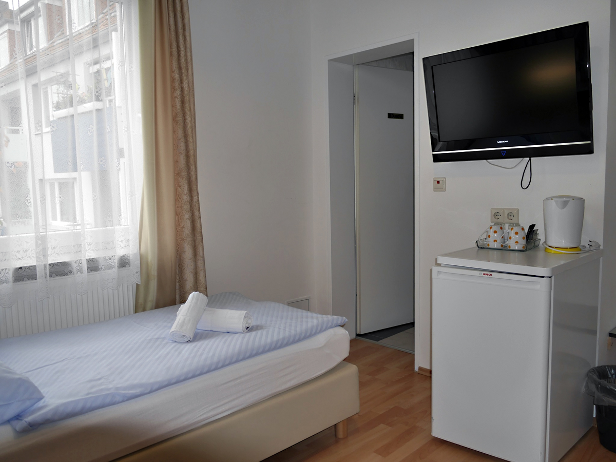 Die Zimmer sind alle ausgestattet mit Flachbildfernseher, KĂŒhlschrank, Kleiderschrank, Wasserkocher und Geschirr.